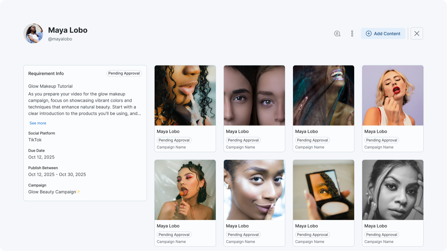 The creator opens their portal and sees the campaign requirements — what to shoot, brand guidelines, publish window.