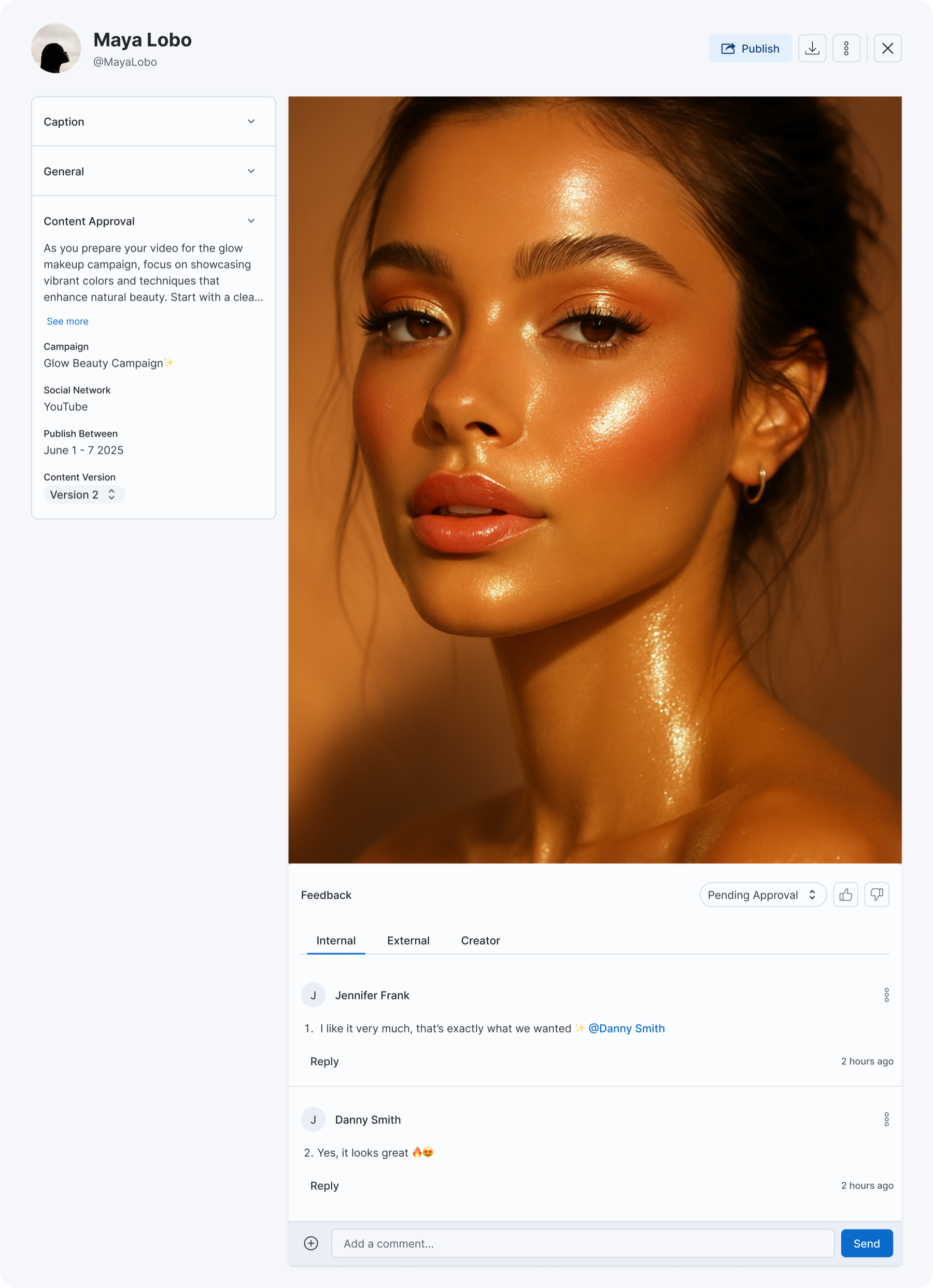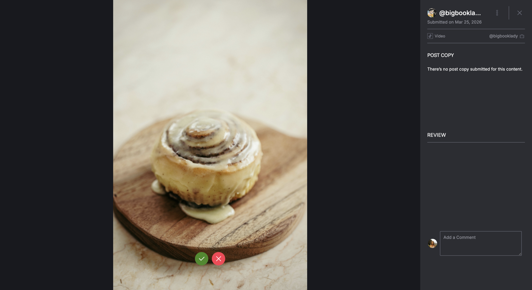 Multi-stakeholder review across internal teams, external partners, and creators. Comments, status tracking, role-based visibility.
