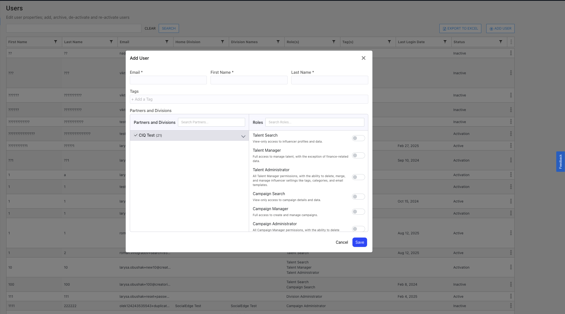 Add User modal with a scrollable list of role toggles. 16 roles with descriptions that don't explain overlap. Admins toggled multiple roles defensively because they couldn't tell what was already included.