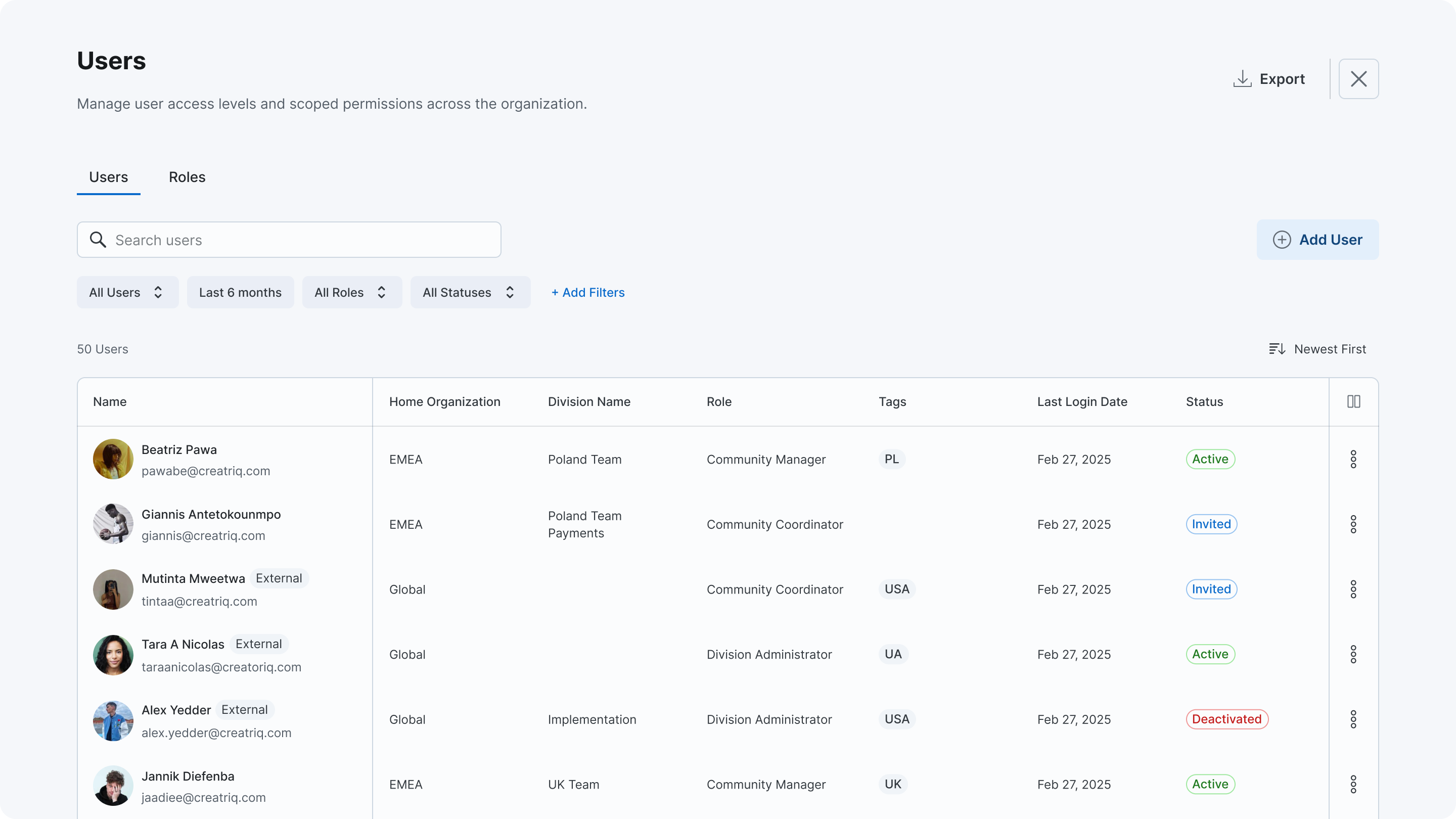 Users list with the new role model: clear Role column, scoped permissions, and organization hierarchy.